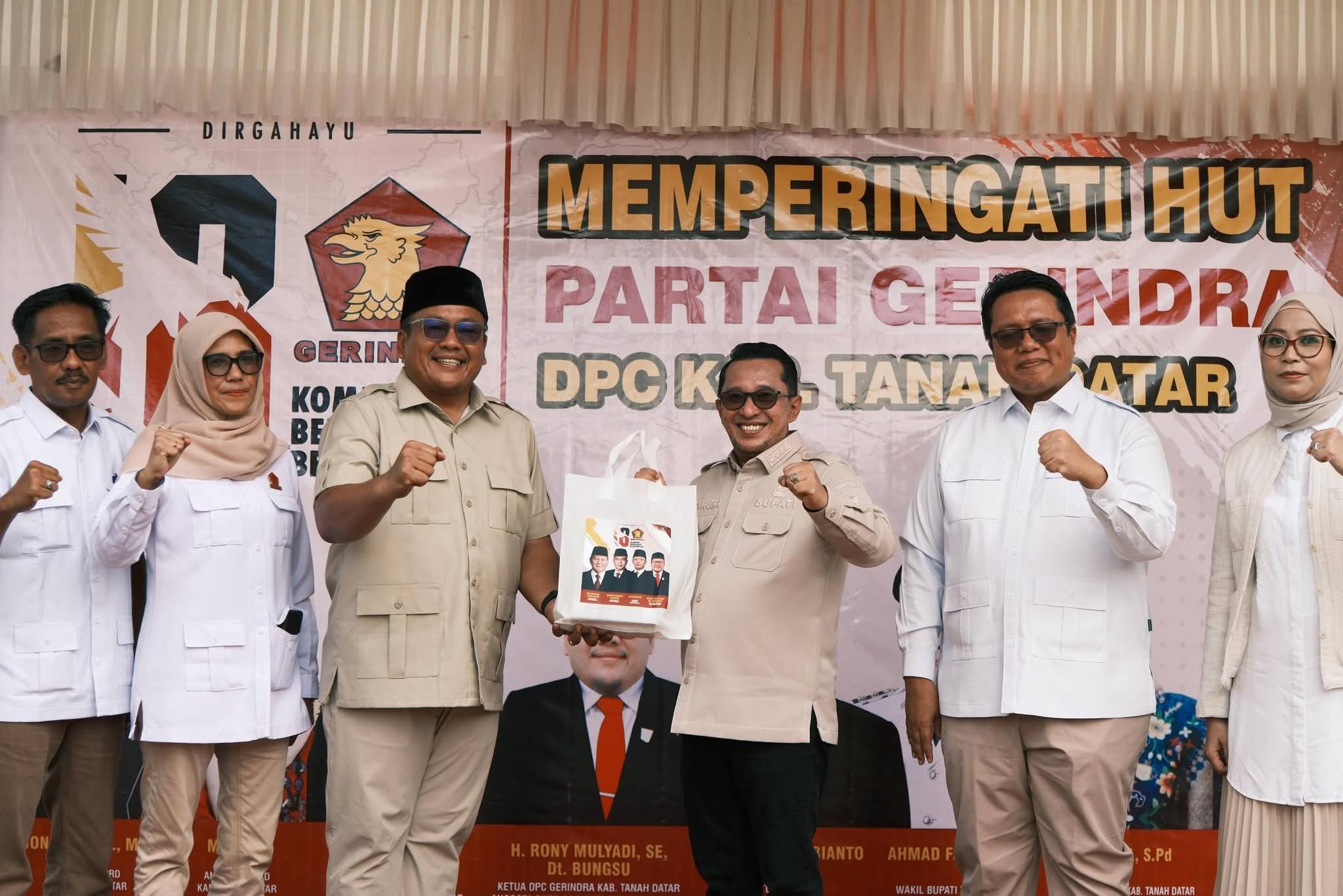 Ketua DPC Partai Gerindra Tanah Datar H. Rony Mulyadi, S.E., D.T. Bungsu sampaikan sekilas berdirinya Partai Gerindra yaitu pada 6 Februari 2008 lalu oleh tokoh-tokoh nasional termasuk Prabowo Subianto, dan berakar kuat pada semangat nasionalisme, keadilan sosial, dan pembelaan terhadap rakyat kecil.