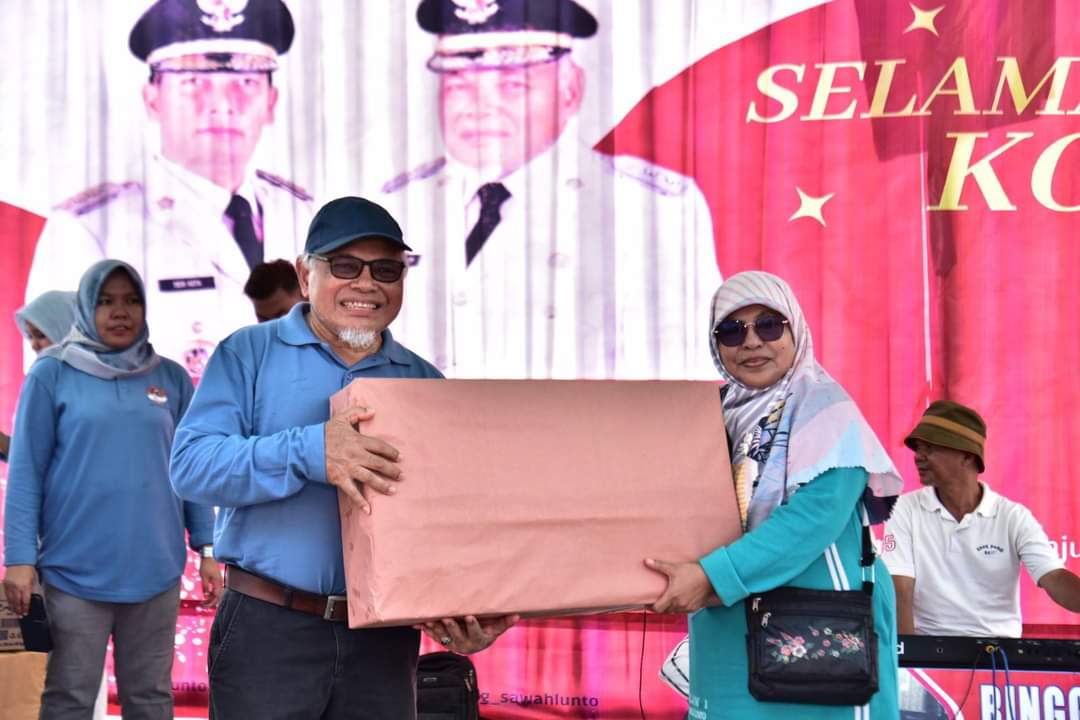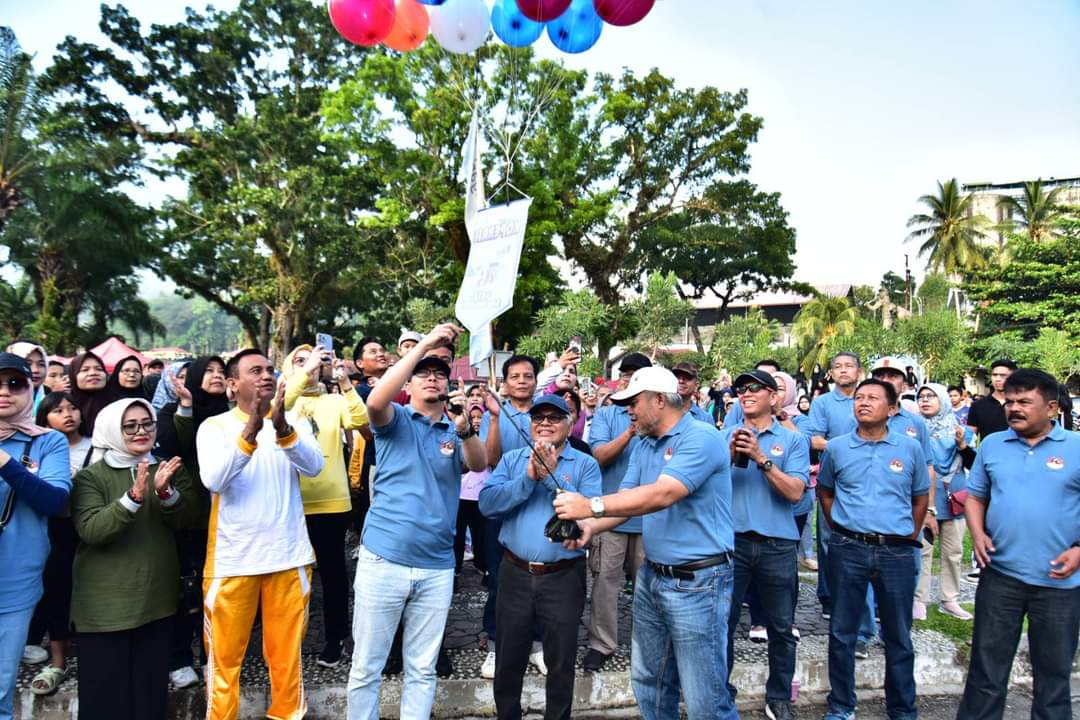 Sawahlunto,—Ratusan Warga Masyarakat ikuti Jalan Santai yang diselenggarakan dalam rangka memeriahkan Hari Koperasi Nasional (Harkopnas) ke-76, di Lapangan Segitiga