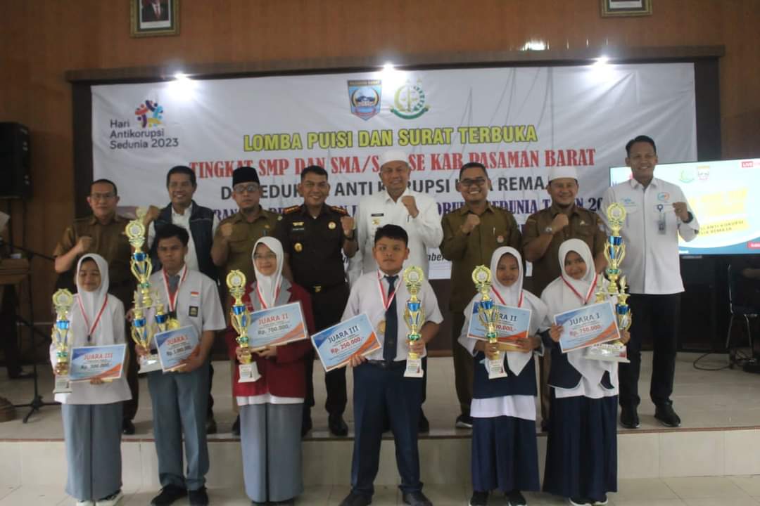 Pasbar,—Kejaksaan Negeri (Kejari) Pasaman Barat (Pasbar) mengadakan Lomba Puisi dan Surat Terbuka Tingkat SMP dan SMA/SMK se-Kabupaten Pasaman Barat serta Edukasi Anti Korupsi usia remaja dengan tema ‘Maju Membangun Negeri Tanpa Korupsi’ di Aula Kantor Kejari setempat.