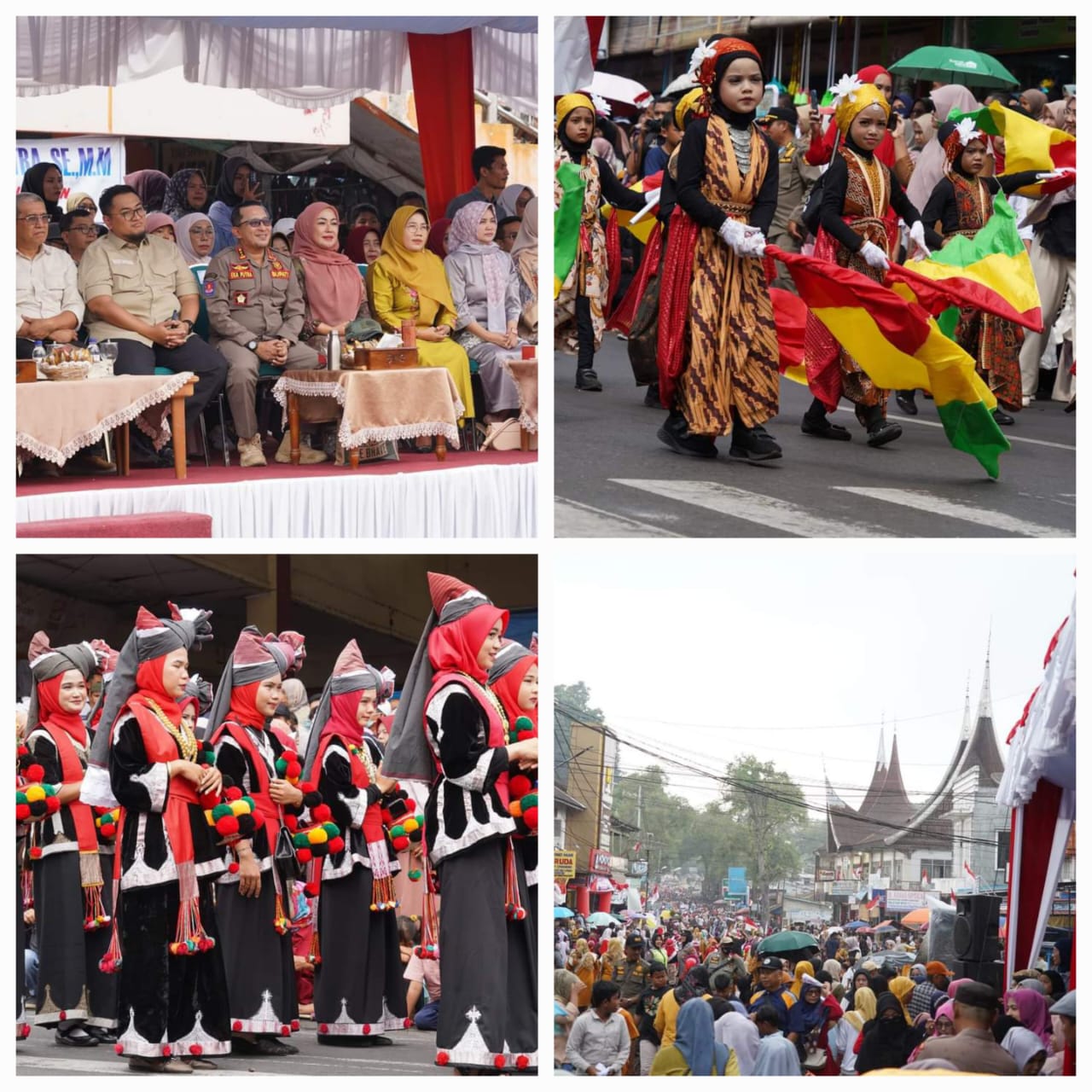 Tanah Datar. Luar Biasa Ribuan Warga Masyarakat saksikan Pawai Allegoris Memperingati HUT Kemerdekaan RI yang ke 79 yang dipusatkan Kota Batusangkar