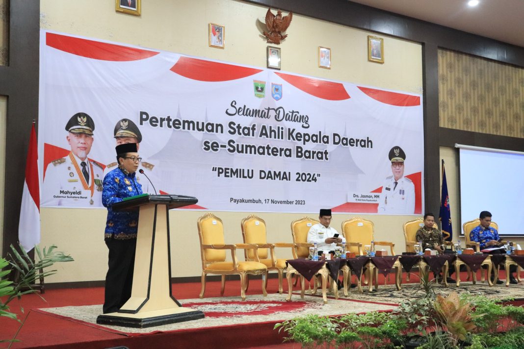 Payakumbuh—Pertemuan Staf Ahli Kepala Daerah se-Sumatera Barat dengan mengusung tema “Pemilu Damai 2024” diadakan  di Aula Ngalau Lt. 3 Balai Kota Payakumbuh, Jumat (17/11/2023).
