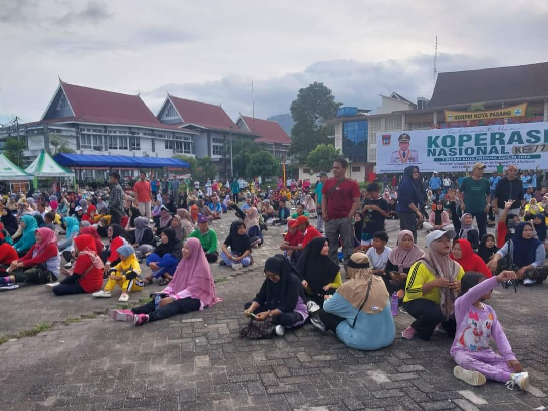 Padang -Ribuan Warga ikuti senam bersama Memperingati Hari Koperasi Nasional (Harkopnas) ke-77 tahun 2024 di Lapangan Apeksi Balai Kota Padang, Minggu (14/07/2024).